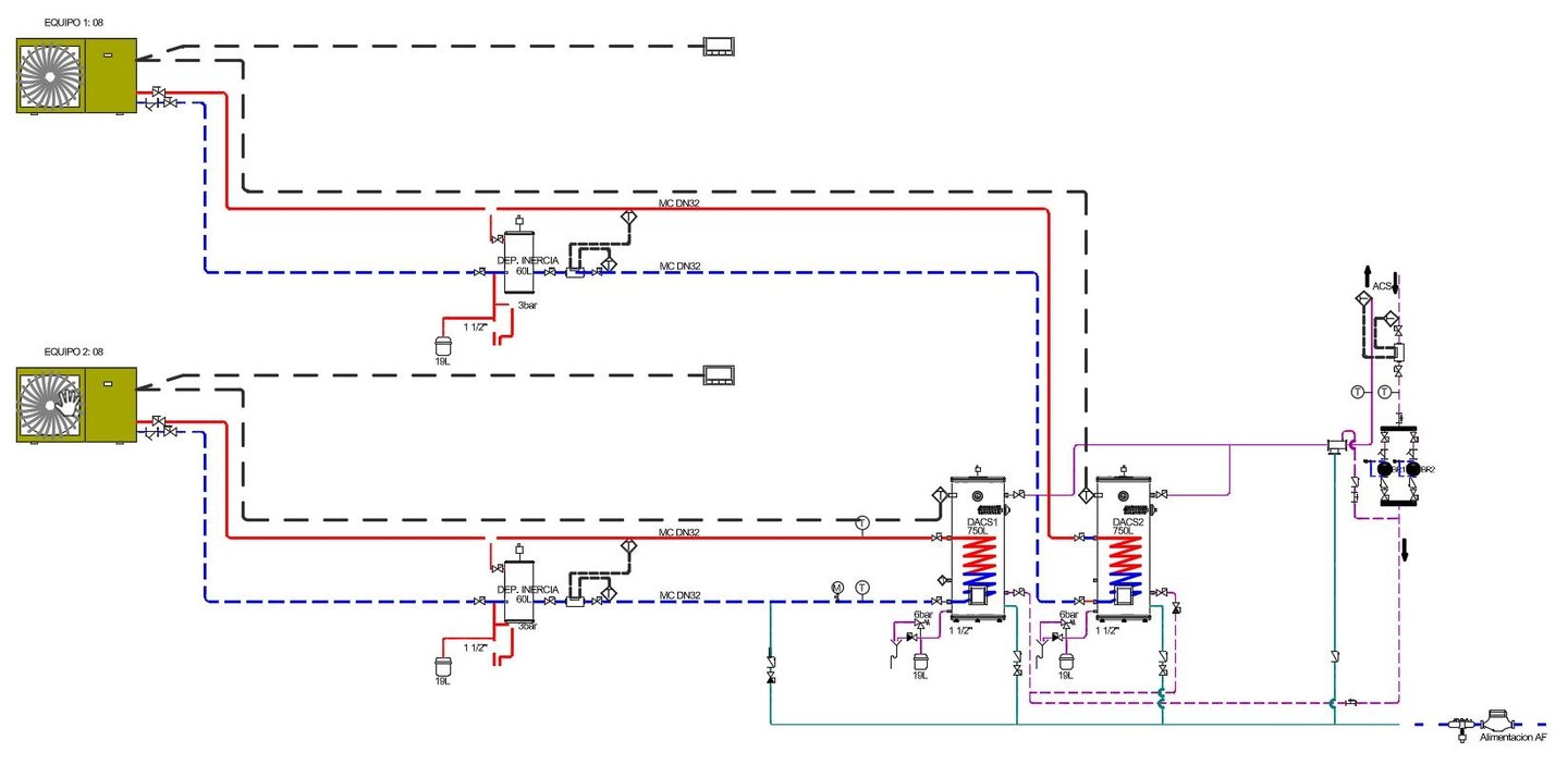 Si solo vamos a realizar el servicio de ACS con aerotermia, que es en la mayoría de los casos, yo recomiendo que esa producción se diseñe mediante 2 equipos. Así siempre garantizaremos la disponibilidad de ACS aun en rotura, o fuera de servicio de uno de ellos (en la figura de abajo podemos ver una instalación con estas condiciones).