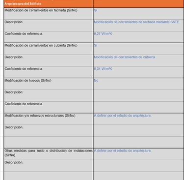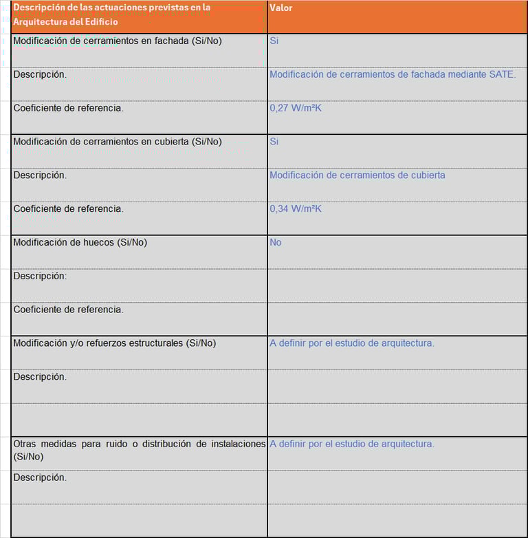 En este punto definimos las actuaciones previstas en la arquitectura del edificio (tanto en cerramientos, como en las necesidades estructurales, refuerzos, etc.).