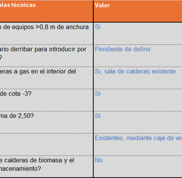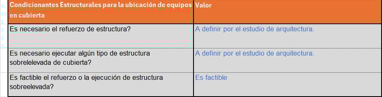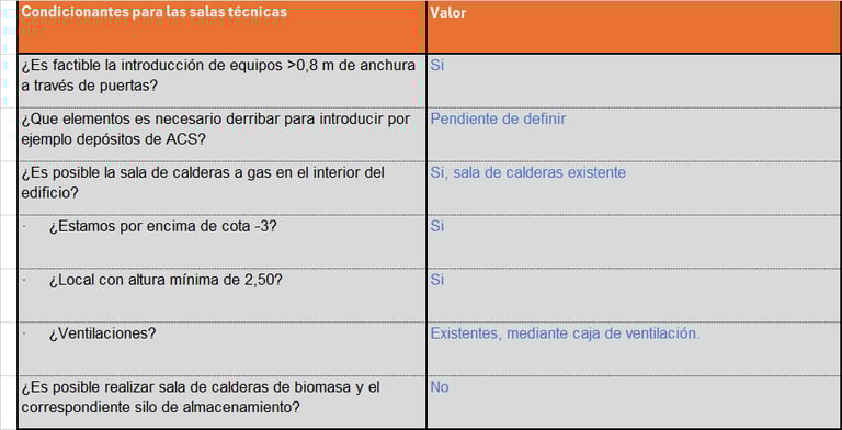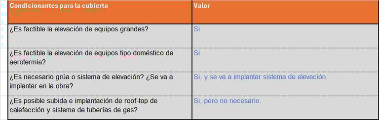 En esta tabla analizamos los condicionantes para la accesibilidad tanto para la ubicación de equipos e instalaciones tanto en la cubierta como en los cuartos técnicos (bombas de calor, calderas, acumuladores, etc.)