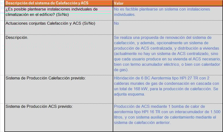 En esta tabla realizamos una breve descripción de los equipos y sistemas previstos para realizar el sistema de calefacción y ACS, y como se ha diseñado el sistema.